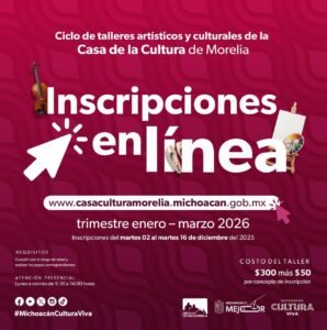 Morelia, Michoacán, 27 de noviembre de 2025.- La Secretaría de Cultura de Michoacán (Secum) anuncia el regreso de las inscripciones en línea para los talleres de la Casa de la Cultura de Morelia, un servicio que facilitará el acceso a la formación artística para el primer trimestre de 2026.