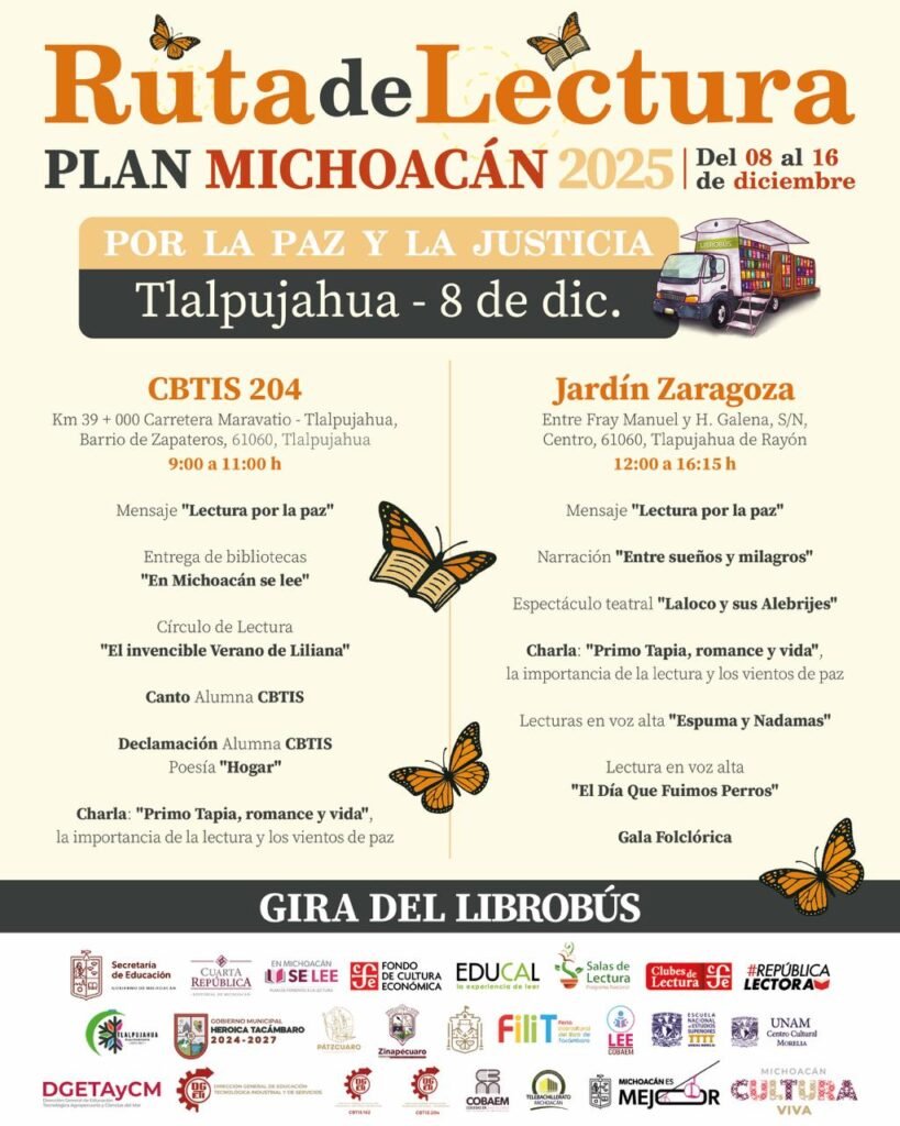 Las actividades iniciarán en el CBTIS 204, de 9:00 a 11:00 horas, con el mensaje “Lectura por la paz”, entrega de bibliotecas del programa En Michoacán Se Lee, un círculo de lectura sobre “El invencible verano de Liliana”, de la escritora Cristina Rivera Garza, así como actividades de declamación, canto y una charla sobre el valor de la lectura y la construcción de paz a través de las historias.