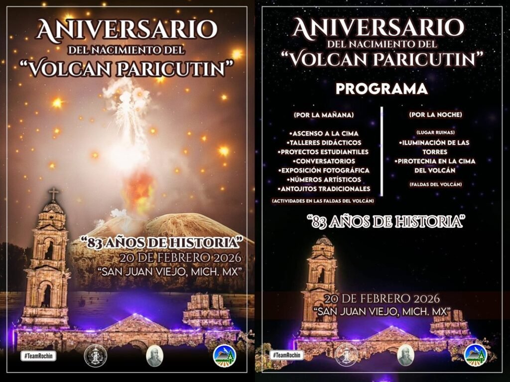Morelia, Michoacán, 17 de febrero de 2026.- Las autoridades de San Juan Parangaricutiro han preparado una serie de actividades para conmemorar los 83 años del nacimiento del volcán Paricutín, informó la Secretaría de Turismo de Michoacán (Sectur), encabezada por Roberto Monroy García.