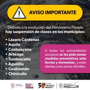 Morelia, Michoacán, 30 de junio de 2025.- Ante el fenómeno meteorológico “Flossie” que se encuentra cerca de las costas michoacanas y en seguimiento a las indicaciones de Protección Civil (PC), la Secretaría de Educación del Estado (SEE) anuncia la suspensión de clases desde hoy hasta que las condiciones climáticas sean propicias para reanudar labores en escuelas públicas y privadas de todos los niveles en 8 municipios.