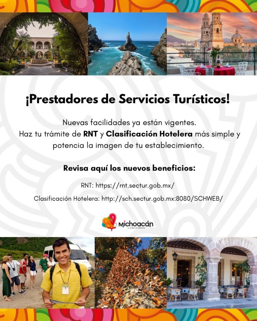 Morelia, Michoacán, 29 de noviembre de 2025.- La Secretaría de Turismo de Michoacán (Sectur), que encabeza Roberto Monroy García, informó que desde el pasado 26 de noviembre de 2025 entraron en vigor cambios importantes al Reglamento de la Ley General de Turismo que harán más sencillo, claro y accesible el proceso de registro y clasificación para los prestadores de servicios turísticos.