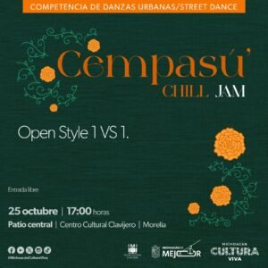 Morelia, Michoacán, 23 de octubre de 2025.- La Secretaría de Cultura de Michoacán (Secum) invita a todas y todos los amantes del baile a participar en el Cempasú´Chill Jam 2025, un encuentro que celebra la danza urbana, la creatividad y el talento joven. La cita es este sábado 25 de octubre a las 17:00 horas en el segundo patio del Centro Cultural Clavijero con entrada libre.