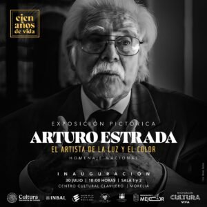 Morelia, Michoacán, 26 de julio de 2025.- La Secretaría de Cultura de Michoacán (Secum) invita a la inauguración de la exposición “Arturo Estrada. Cien años de vida. El artista de la luz y el color”, el próximo 30 de julio a las 18:00 horas en las salas 1 y 2 del Centro Cultural Clavijero. La muestra permanecerá abierta al público de forma gratuita hasta febrero de 2026.