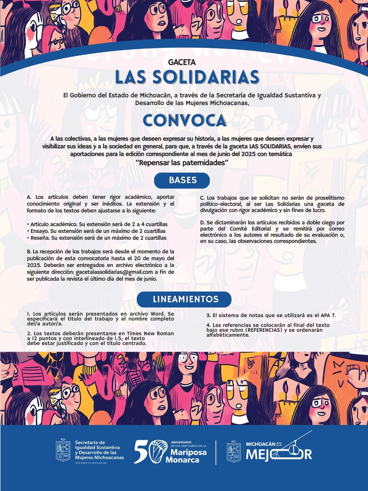Morelia, Michoacán, a 23 de abril de 2025.- La Secretaría de Igualdad Sustantiva y Desarrollo de las Mujeres Michoacanas (Seimujer), encabezada por Alejandra Anguiano González, convoca a colectivas, académicas, mujeres y sociedad en general a participar en la próxima edición de la gaceta Las Solidarias, un espacio de difusión y reflexión feminista impulsado por el Gobierno de Michoacán.