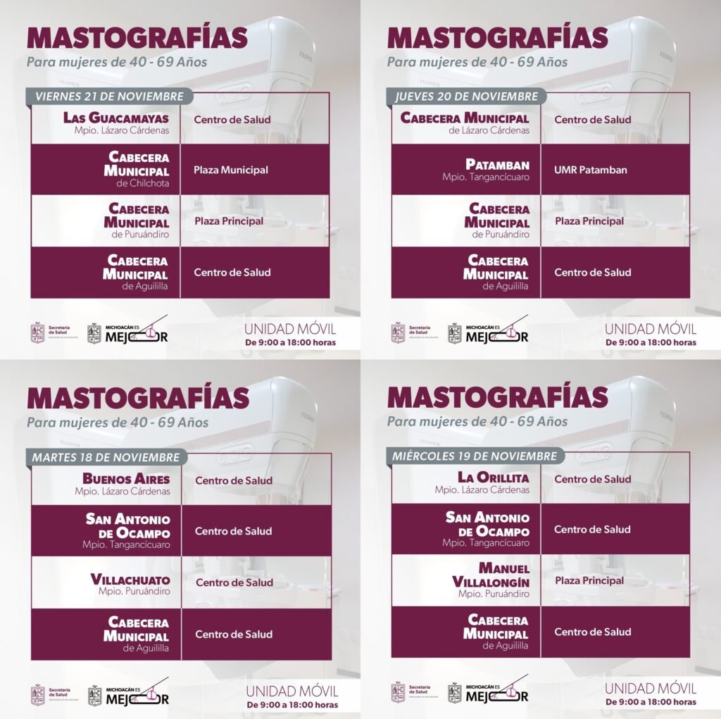 Ofrecerán estudios gratuitos dirigidos a michoacanas de 40 a 69 años, del 18 al 21 noviembre en Lázaro Cárdenas, Puruándiro y Aguililla; del 18 al 20 en Tangancícuaro y el día 21 de noviembre en Chilchota. Las fechas, horarios y ubicación se pueden consultar en el siguiente enlace https://www.facebook.com/share/p/1G9Tc9Bjwc/.