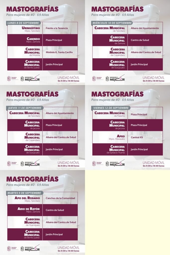 Morelia, Michoacán, 6 de septiembre de 2025.- Del 8 al 12 de septiembre, la Secretaría de Salud de Michoacán (SSM) realizará mastografías gratuitas a mujeres de 40 a 69 años en los municipios de Tancítaro, Jacona, Copándaro, Susupuato, Paracho, Maravatío, Epitacio Huerta, Zamora, Huaniqueo, Benito Juárez y Morelia.