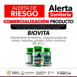 Morelia, Michoacán, 16 de julio de 2025.- La Comisión Federal para la Protección contra Riesgos Sanitarios (Cofepris) a través de la Secretaría de Salud de Michoacán (SSM), emite una alerta sanitaria a la población en general respecto a la comercialización del producto denominado “Suplemento alimenticio Biovita, cápsulas a base de canela, manzana, pomelo, piña y vitaminas B6, B12″, clasificado como publicidad engañosa.