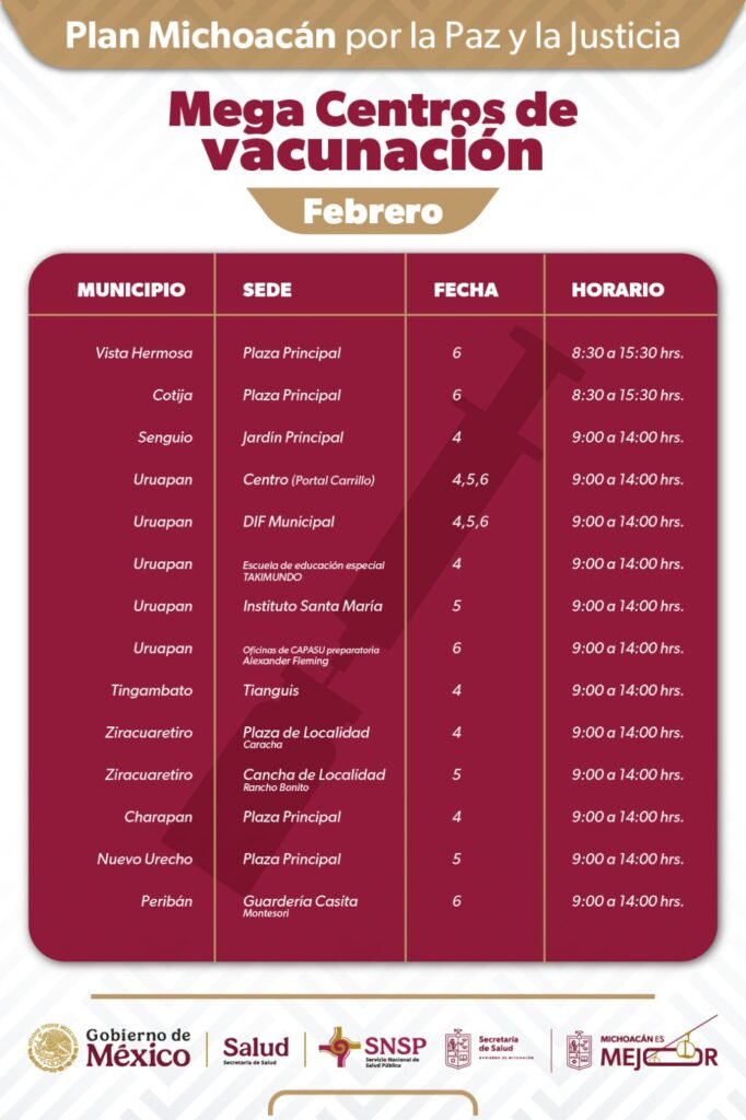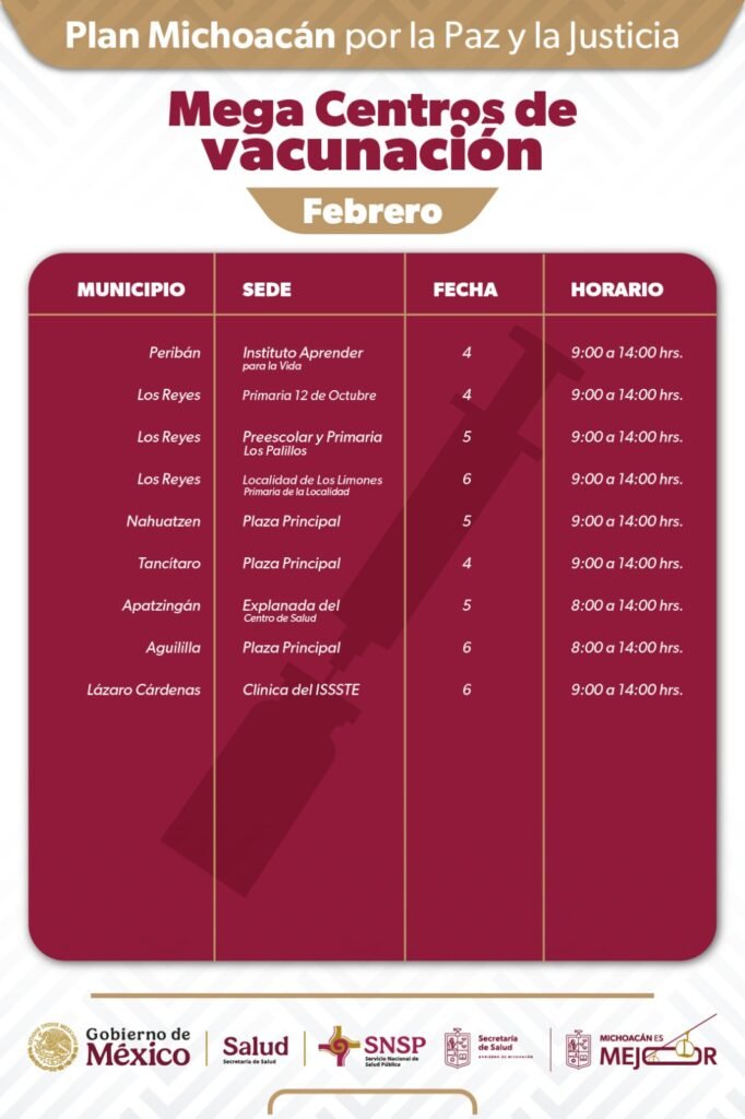 El personal de salud aplicará dosis gratuitas para prevenir enfermedades estacionales y riesgos epidemiológicos, tales como influenza, COVID-19, neumococo y sarampión, en localidades de los municipios de Vista Hermosa, Cotija, Senguio, Uruapan, Tingambato, Ziracuaretiro, Charapan, Nuevo Urecho, Peribán, Los Reyes, Nahuatzen, Tancítaro, Apatzingán, Aguililla y Lázaro Cárdenas.