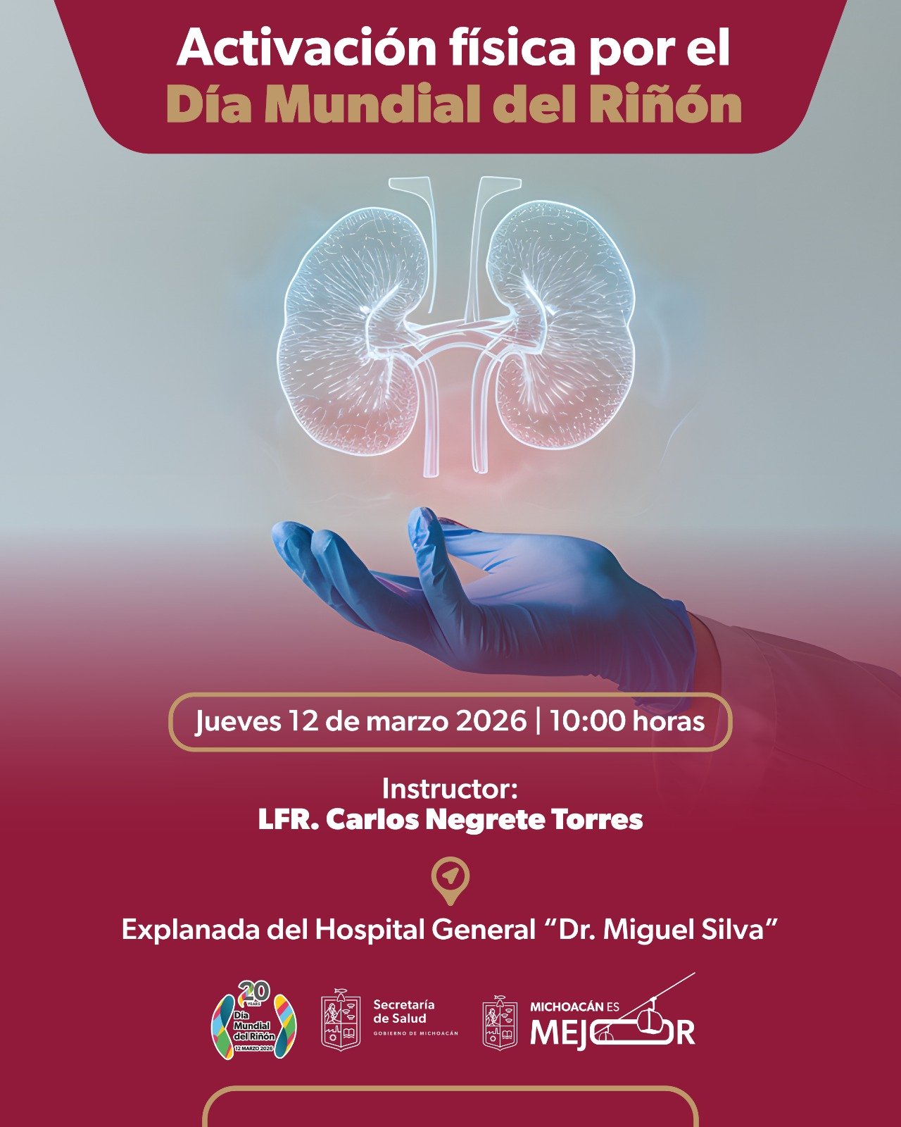 Morelia, Michoacán, 10 de marzo de 2026.- La Secretaría de Salud de Michoacán (SSM) invita a la población general y al personal de salud a participar en la Jornada de Activación Física por el Día Mundial del Riñón, como parte de las acciones para fomentar estilos de vida saludables y prevenir enfermedades crónico-degenerativas.