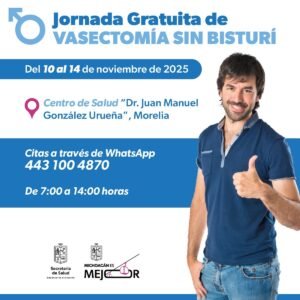 Morelia, Michoacán, 6 de noviembre de 2025.- Como parte de las acciones del Mes de la Salud Reproductiva, la Secretaría de Salud de Michoacán (SSM) llevará a cabo una jornada gratuita de vasectomía sin bisturí del 10 al 14 de noviembre de 2025, en el Centro de Salud de Morelia “Dr. Juan Manuel González Urueña”, ubicado en Benito Juárez 225, Centro.