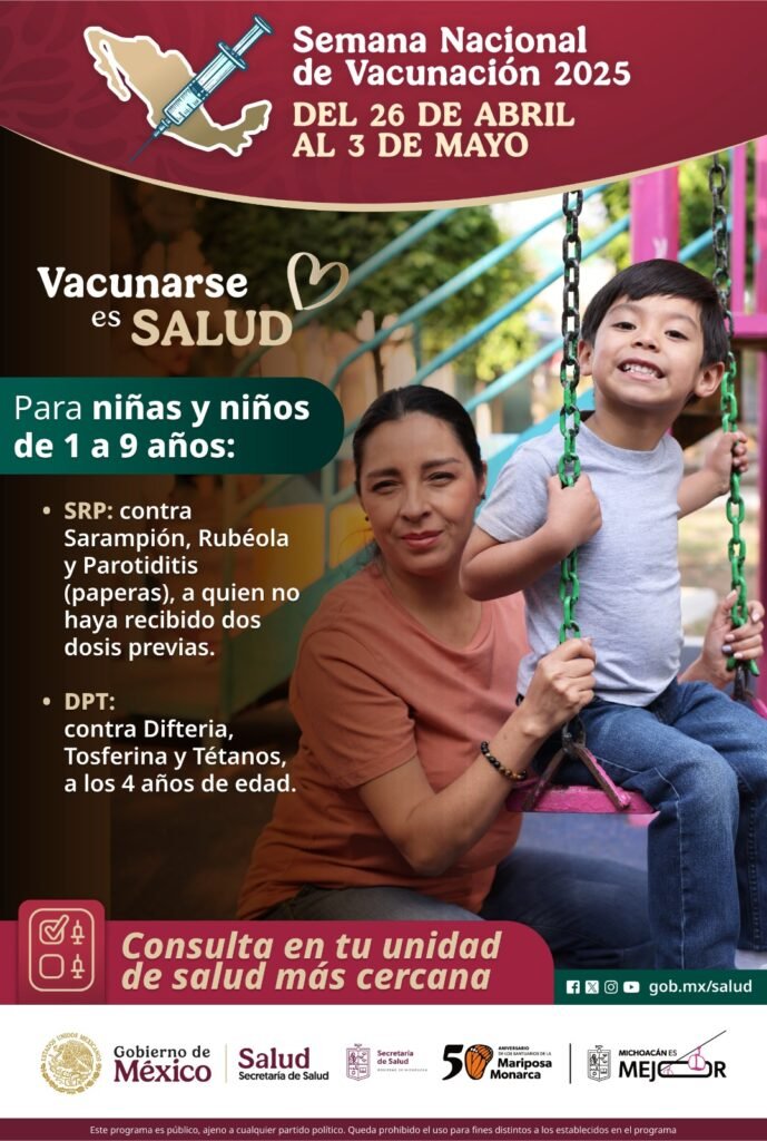 Morelia, Michoacán, a 29 de abril de 2025.- A fin de proteger a la población infantil contra enfermedades prevenibles y garantizar su bienestar, la Secretaría de Salud de Michoacán (SSM) hace un llamado a madres y padres de familia a llevar a sus hijas e hijos de 1 a 9 años de edad a los centros de salud para completar o iniciar su esquema de vacunación.