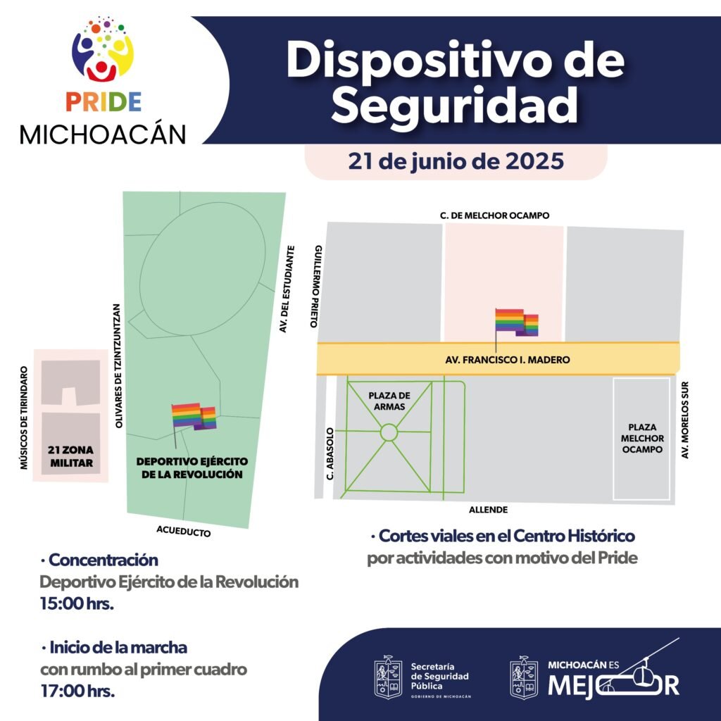 Morelia, Michoacán, 19 de junio del 2025.- Para garantizar el orden y prevenir accidentes viales, la Secretaría de Seguridad Pública (SSP) desplegará un dispositivo de seguridad especial este próximo sábado 21 de junio en Morelia, con motivo de la marcha del Orgullo LGBTTTIQ+. La SSP busca asegurar que el evento se desarrolle en un ambiente de tranquilidad y respeto para todas y todos los participantes.