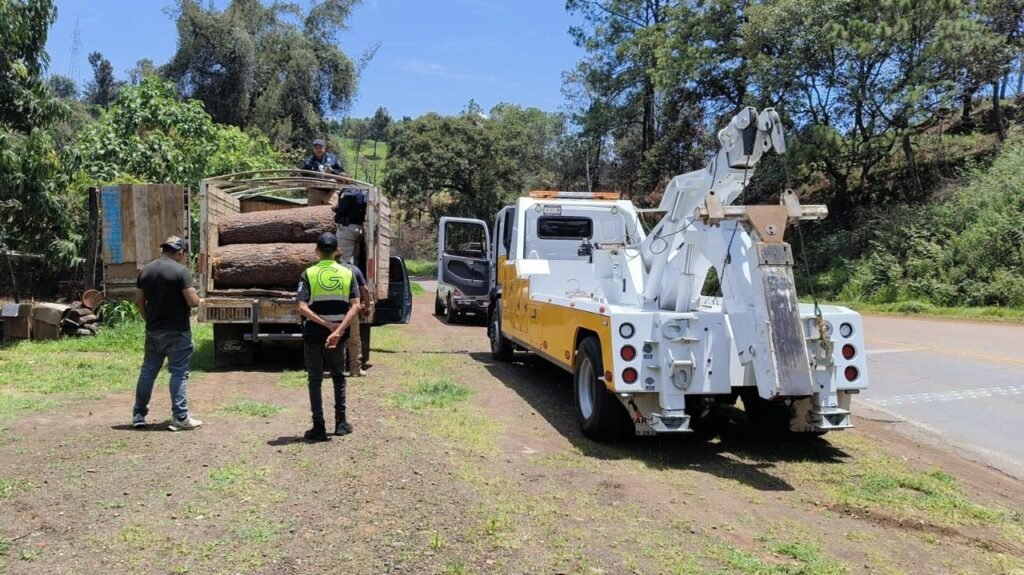 Uruapan, Michoacán, 24 de julio de 2025.- Tras recibir una denuncia por tala ilegal en un bosque en Uruapan, elementos de la Secretaría de Seguridad Pública (SSP) y la Policía Municipal aseguraron un predio. En el lugar, se encontraron los restos de árboles talados de manera ilícita, equivale a 34 mil metros cúbicos de terreno afectado, además de dos vehículos, uno de ellos con reporte de robo.