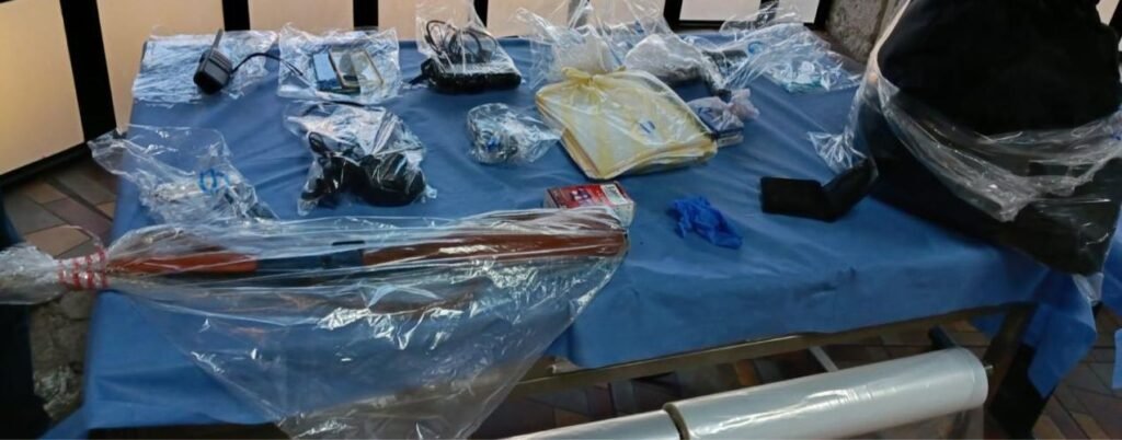 Asimismo, se localizaron diversos aditamentos tácticos, equipo de comunicación, teléfonos celulares, un escáner de automóviles, documentación y un uniforme policial.