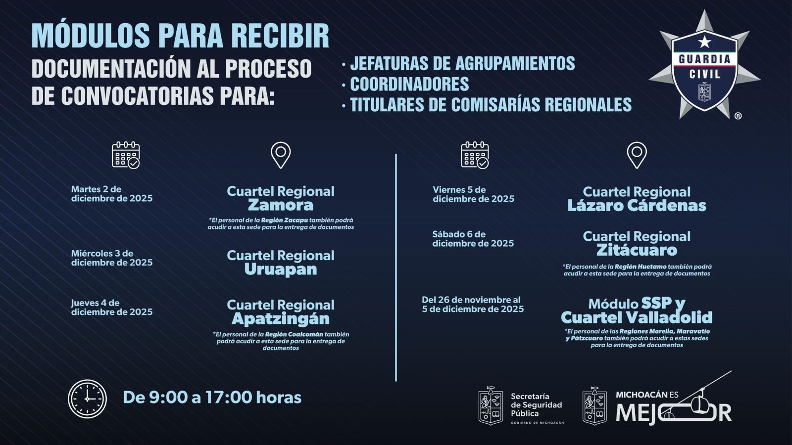 Morelia, Michoacán, 2 de diciembre de 2025.- La Secretaría de Seguridad Pública (SSP), encabezada por José Antonio Cruz Medina, habilitó módulos de registro en siete municipios del estado para que el personal operativo participe en las convocatorias de mandos de la Guardia Civil, correspondientes a jefaturas de agrupamientos, coordinaciones y comisarías regionales.