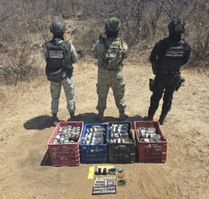 El personal de la Guardia Civil, Ejército Mexicano y Guardia Nacional llevó a cabo el levantamiento de más de un centenar de explosivos improvisados para ser lanzados desde dron, cuando efectuaban patrullajes preventivos en caminos de terracería de dicha comunidad.