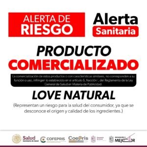 Morelia, Michoacán, 9 de diciembre de 2025.- La Comisión Federal para la Protección contra Riesgos Sanitarios (Cofepris), a través de la Secretaría de Salud de Michoacán (SSM), alerta a la población sobre el riesgo sanitario de los suplementos alimenticios Love Natural, los cuales se comercializan sin cumplir la legislación vigente, representando un peligro para la salud.