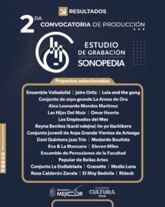 Morelia, Michoacán, 26 de febrero de 2026.- La Secretaría de Cultura de Michoacán (Secum) publicó los resultados de la segunda convocatoria de producción del estudio de grabación Sonopedia 2026, dirigida a fortalecer la creación, registro y profesionalización de proyectos musicales y sonoros en el estado.