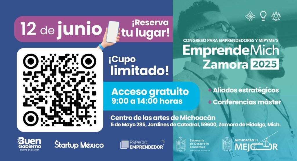 Morelia, Michoacán, 5 de junio de 2025.- El Gobierno de Michoacán, a través de la Secretaría de Desarrollo Económico (Sedeco), anunció el Congreso EmprendeMich Zamora 2025, un espacio diseñado para brindar herramientas reales a personas emprendedoras y a las micro, pequeñas y medianas empresas que desean fortalecer o iniciar un negocio en el estado.