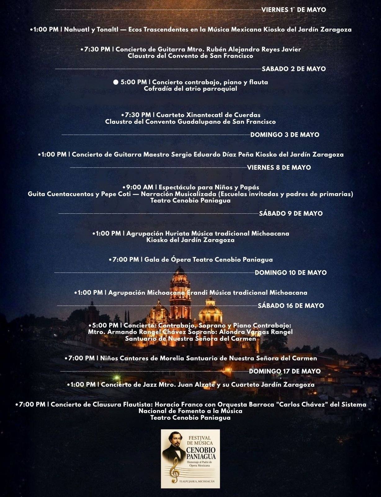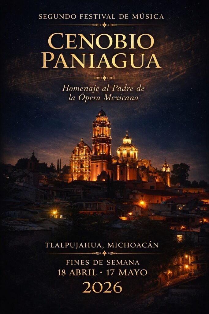 Morelia, Michoacán, 16 de abril de 2026.- La segunda edición del Festival de Música Cenobio Paniagua 2026 se realizará del 18 de abril al 17 de mayo en el Pueblo Mágico de Tlalpujahua, lo que lo consolida como un producto turístico-cultural de creciente proyección estatal y nacional, informó la Secretaría de Turismo estatal (Sectur), dependencia dirigida por Roberto Monroy García.