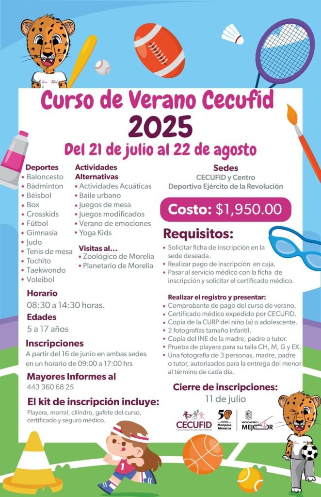 Morelia, Michoacán, 18 de junio de 2025.- La Comisión Estatal de Cultura Física y Deporte (Cecufid) informa que las inscripciones para sus Cursos de Verano y de Natación 2025 ya están abiertas. Podrán registrarte hasta el 11 de julio para participar en las actividades que se realizarán en las instalaciones del Centro Deportivo Ejército de la Revolución (CDER) y Molino de Parras.