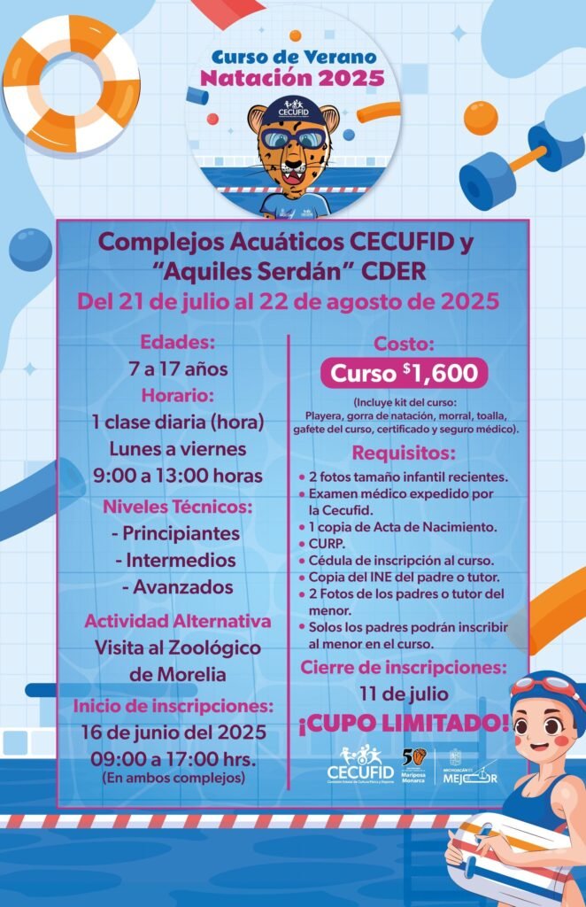 Mientras que, el Curso de Natación de la Cecufid 2025, se realizará en las mismas fechas, de lunes a viernes, pero con una sesión diaria de 60 minutos entre 9:00 y 13:00 horas, en los complejos Acuáticos Aquiles Serdán y Molino de Parras. Está dirigido a participantes de siete a 17 años en los niveles principiantes, intermedios y avanzados; el costo es de mil 600 pesos, el horario y fechas de inscripción es igual que el de verano.