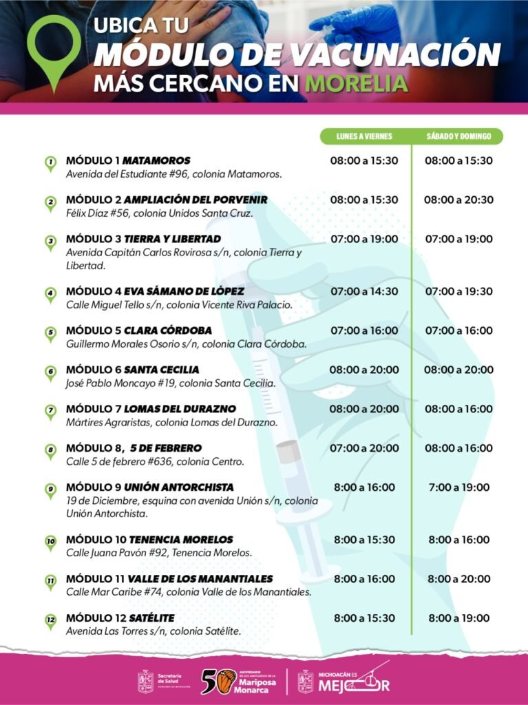 Los módulos de vacunación están equipados con personal de salud capacitado para atender a los menores y resolver cualquier duda sobre el proceso de vacunación, la atención se brinda de lunes a domingo. Para conocer el horario y ubicación de los 12 módulos podrás consultar el siguiente enlace https://salud.michoacan.gob.mx/ubica-los-12-modulos-de-vacunacion-de-la-ssm-en-morelia/