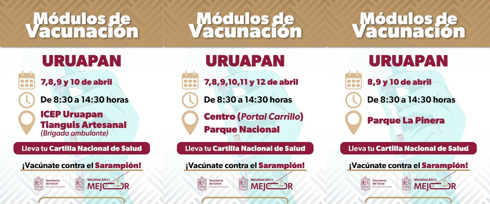 Los módulos se instalarán del 7 al 12 de abril en el Portal Carrillo y en el Parque Nacional; asimismo, del 7 al 10 de abril operarán en el ICEP Uruapan y en el Tianguis Artesanal; y del 8 al 10 de abril, en el Parque La Pinera. Todas las sedes atenderán en un horario de 8:30 a 14:30 horas, con personal de enfermería encargado de revisar cartillas y aplicar las dosis de forma gratuita y segura.