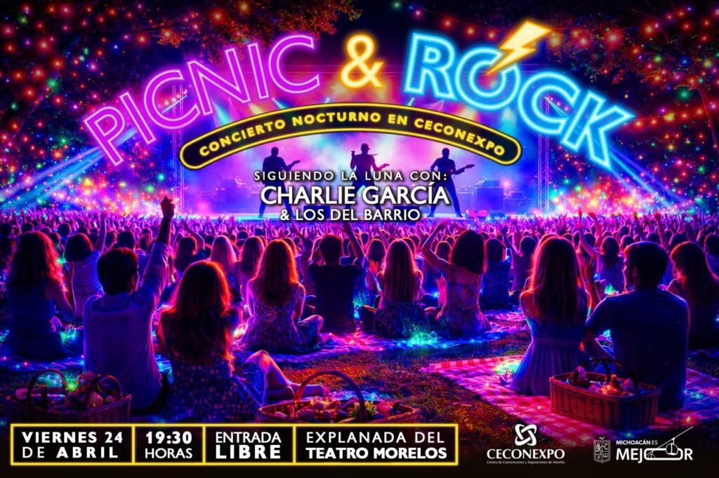 Morelia, Michoacán, 23 de abril de 2026.- El Centro de Convenciones y Exposiciones de Morelia (Ceconexpo) invita al evento “Picnic & Rock: Siguiendo la Luna”, que se realizará el viernes 24 de abril a las 19:30 horas en la explanada del Teatro Morelos, con acceso libre.