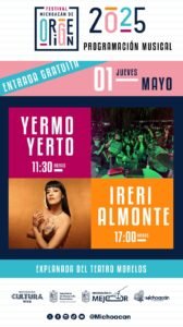 A las 11:30 horas se presentará el grupo Yermo Yerto, conformado por jóvenes músicos morelianos cuya propuesta fusiona diversos ritmos latinoamericanos como cumbia colombiana, son jarocho, merengue, salsa, samba, chicha, reggae, son cubano, bolero, blues funk y afrobeat. Su nombre evoca paisajes áridos y fríos, pero es precisamente esa sensación de quietud la que buscan transformar con su música, al dar vida y movimiento a lo aparentemente estéril a través de una experiencia sonora vibrante y poética.